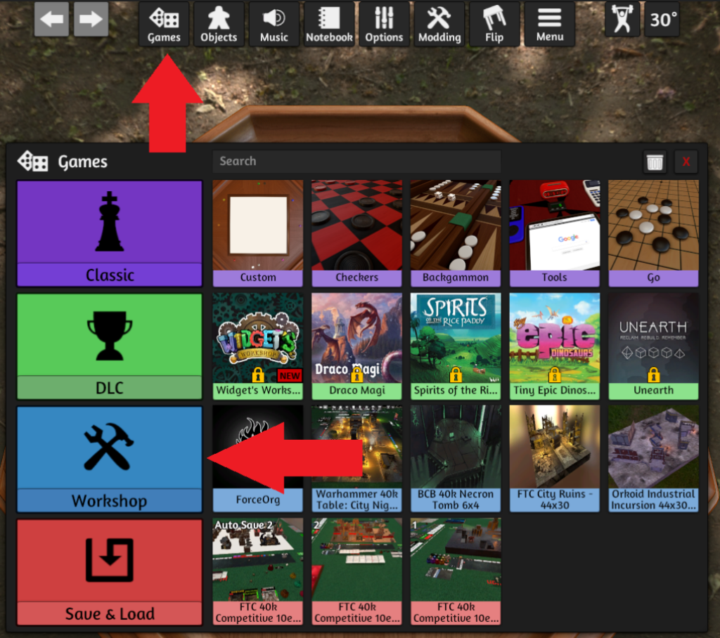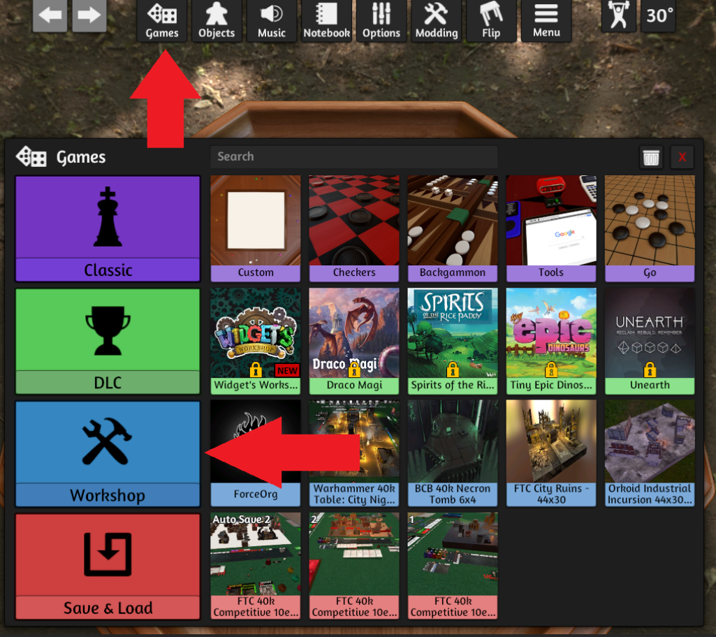 Po zapnutí hry vyberte záložku Games v horním menu a FTC Competitive 40k Map Base naleznete v sekci Workshop: