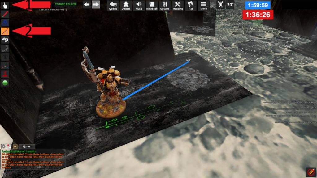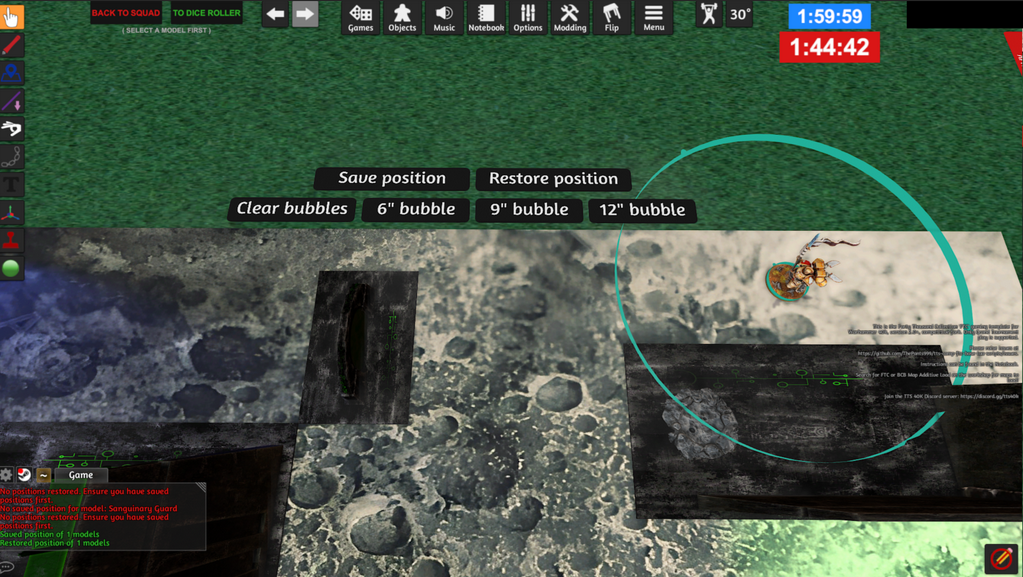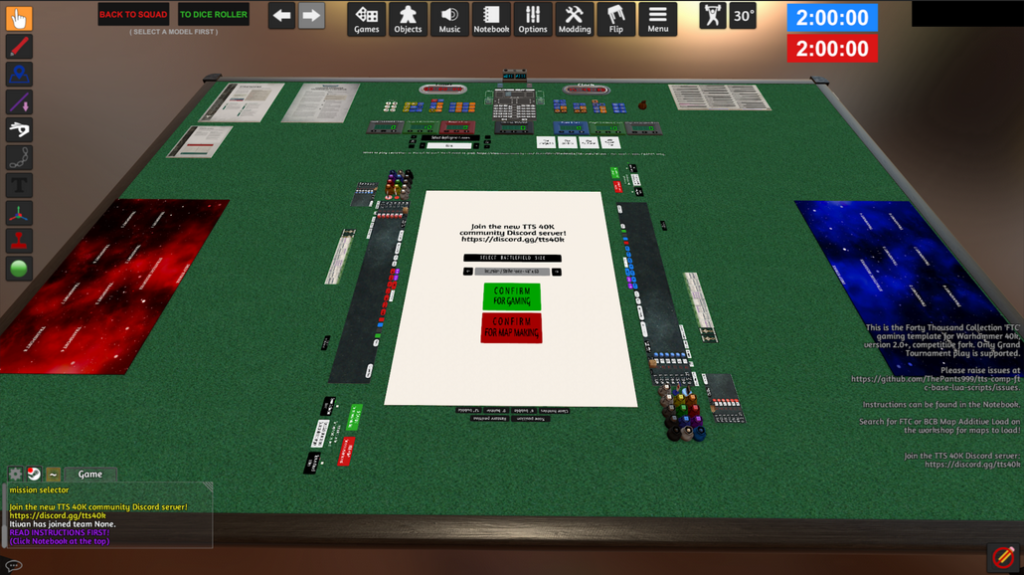 Před začátkem hraní je potřeba vybrat a potvrdit zeleným tlačítkem “Confirm for gaming” rozměry mapy a nahrát mapy a terény. I když doplněk FTC Competitive 40k Map Base sám obsahuje nástroje pro tvorbu mapy, je pro začátek vhodnější nahrát si na stůl již připravenou mapu.