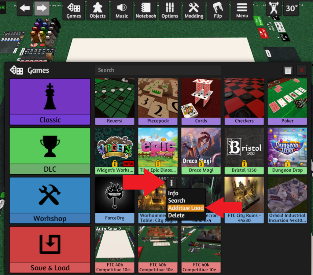 Pokud máme otevřený přídavek FTC Competitive 40k Map Base a potvrzené rozměry mapy, přes horní menu “Games” vybereme v kolonce “Workshop” vybereme připravené mapy – nyní však ne kliknutím, ale přes tři tečky tlačítka “Options” a zvolíme “Additive Load”. Tím se mapa otevře v rámci FTC Competitive 40k Map Base a ne namísto něj.