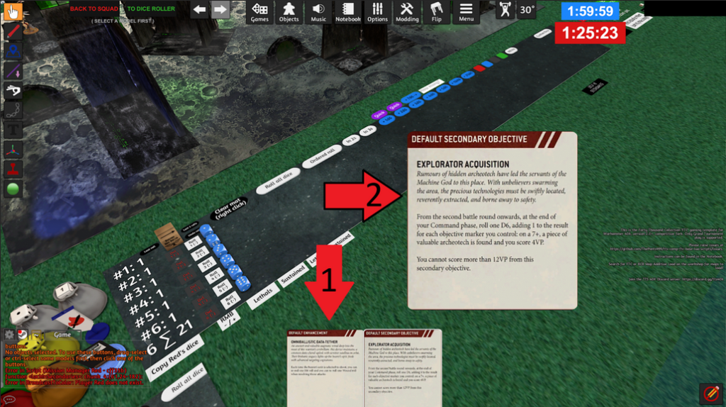 1) Oblast “karet v ruce” – ve výchozím nastavení jsou zde popisky fixních sekundárních misí, nicméně ty lze smazat (označit + delete) a do oblasti umístit jiné karty – např. datasheety vašich jednotek, pokud jste si je uložili při sestavování armády