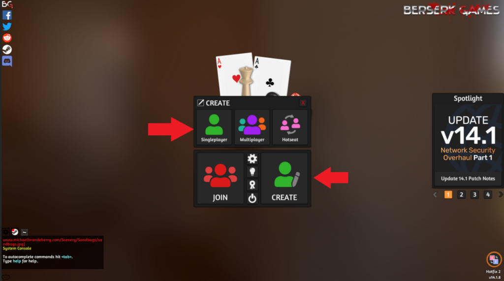 Po zapnutí hry vám hra zpřístupní úvodní obrazovku, na které si musíte vybrat, zda se připojíte do nějaké již vytvořené hry (Join), nebo budete hru vytvářet sami (Create). Pro trénink s Tabletop Simulátorem je dobré zkusit si vytvořit Single player hru, u které vás ve zkoušení nebude nikdo rušit.