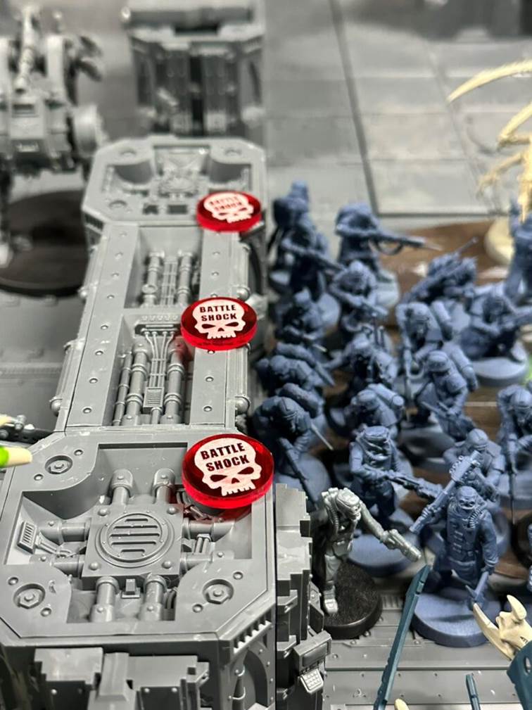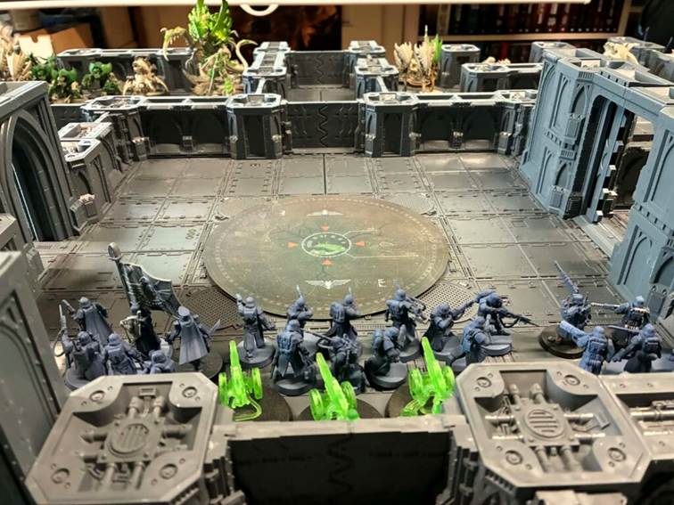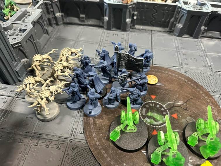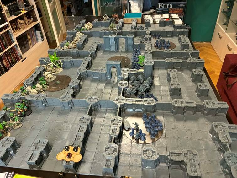 Po pátém kole byla situace taková, že nidi ovládali středový objective a dva další, garda měla pozice na dvou zadních. Bodové skore bylo ve prospěch gardy, nicméně do osmého kola by toho už neudrželi dost a hra tak skončila mírným víteztvím pro xenos. Odnášíme si pár poznatků do příště, rezervy do zad byly příliš silné a bud je do příště omezíme nebo to chce přidat obráncovi pár bodů. Ovládání dveří se osvědčilo, odolnost také. V plánu je víc větších dveří, plus automatizovaná obrana heavy bolterů schovaná ve sloupech.