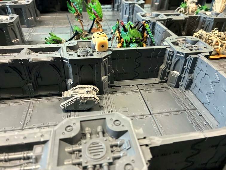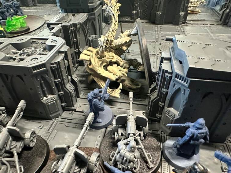 Pravé křídlo vyslalo Bulgryny do protiútoku, kde na dvě kola zvládli blokovat carnifexe, warriory, leapery, tyrant guardu i termagaunty. Úzké dveře jsou prostě úzké. Na středu jeden Carnifex pokusil o solo akci, prorazil druhý bulkhead a následně byl oneshotnut zkušeným Scion veteránem s meltou (8dmg bez savu, pápá).
