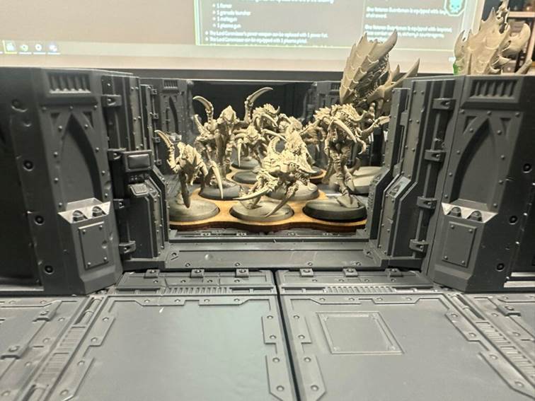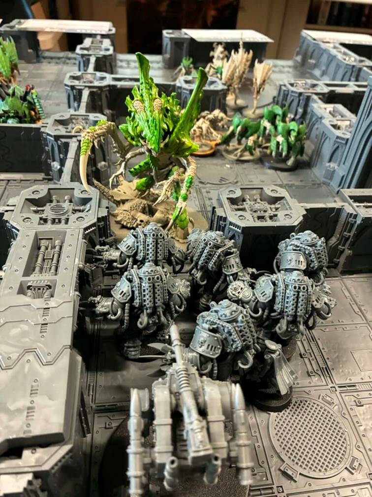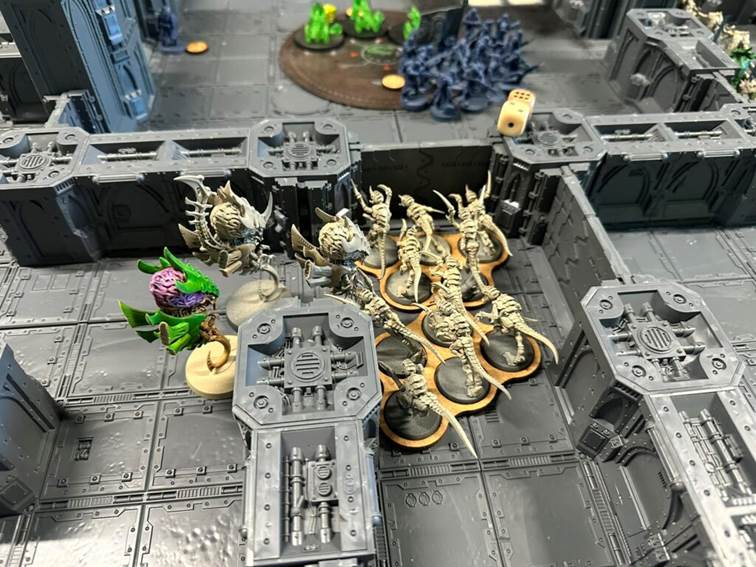 Tyranidi začínají, po celé šířce stolu se zakusují do prvních bulkheadů. Hrot útoku tvoří Carnifexové s crushing claws, support dělají Zoanthropy. První kolo dveře přečkají jen se ztrátou životů čehož obránce využívá pro rychlý nástup do výhodných obranných pozic.